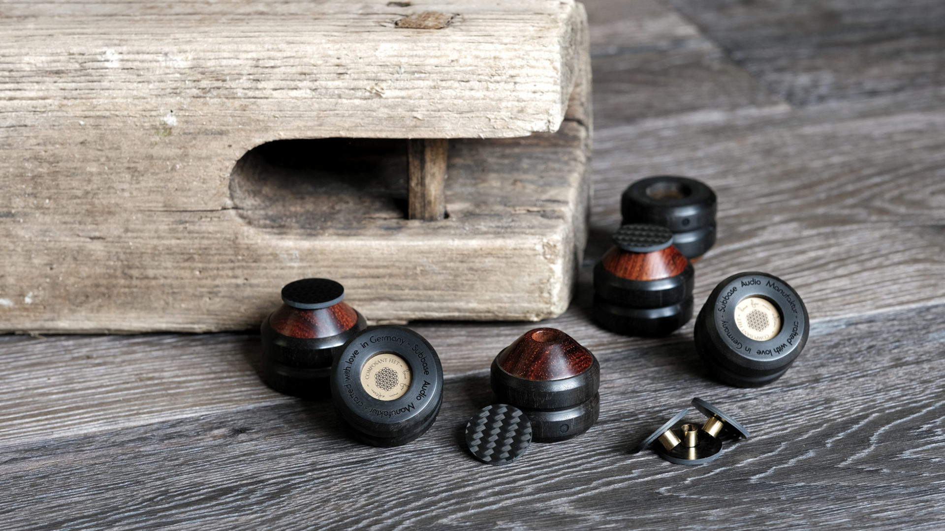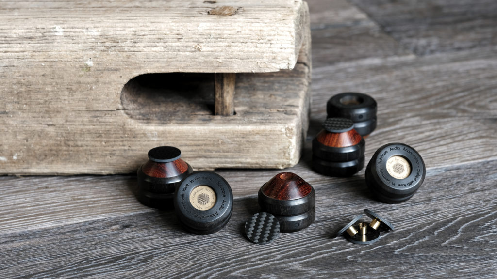 Die neuen CF ermöglichen uns eine dichte Fleischeslust innerhalb der Musik zu bekommen, die wir so noch nicht gehört haben. Die Musiker werden immer dichter in ihrer Präsenz so, dass man nicht nur die Instrumente hört. Die Klangfarben-Opulenz ist sehr besonders, sie setzt nicht auf oder macht zu viel, alles ist sehr stimmig und allumfassend richtig. Eine Garantie für die bestmögliche Performance geben wir allerdings nur in Verbindung mit der Composant S Basis. Die CF sind ausnahmslose Ankopplungsfüße und bewirken keine Entkopplung. Ist der Untergrund also nicht ideal, so fügen sich dessen Koppelfrequenzen in das Gesamtergebnis ein. Ein 3´er Set ist nur direkt bei Subbase Audio zu beziehen und kostet 480 Euro.“ [Foto siehe unten)