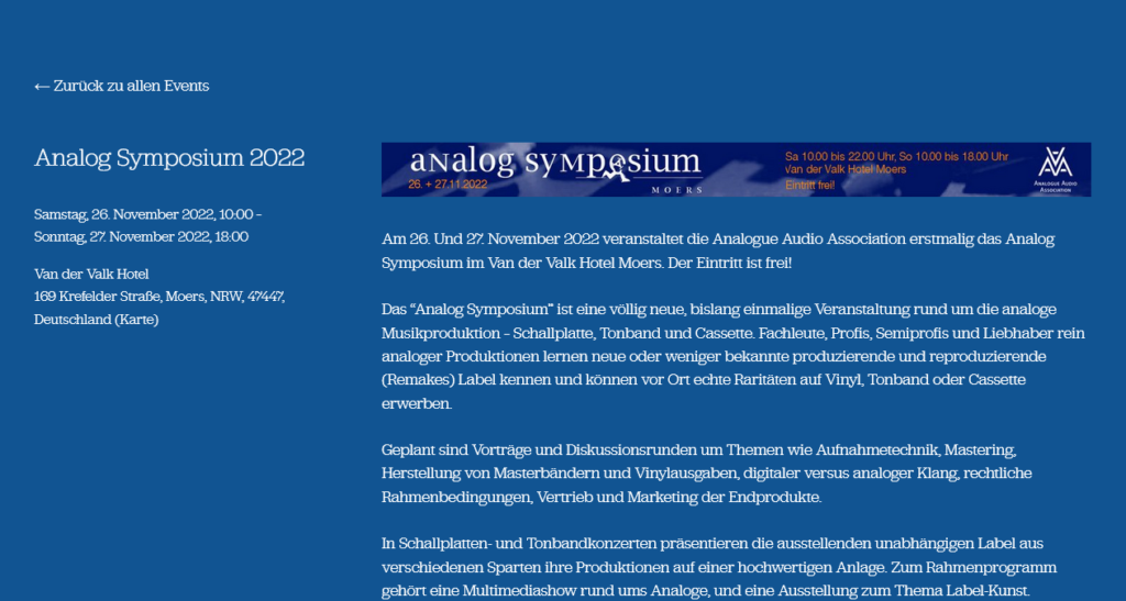 „Am 26. Und 27. November 2022 veranstaltet die Analogue Audio Association erstmalig das Analog Symposium im Van der Valk Hotel Moers. Der Eintritt ist frei!