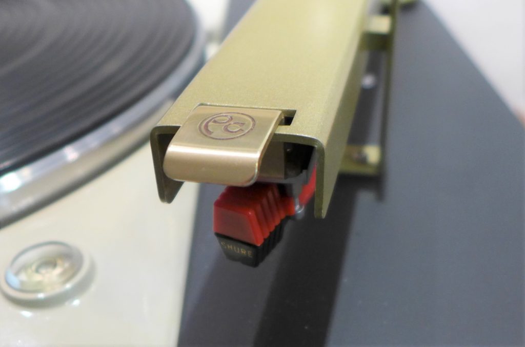 Das Aufsetzen des Pickering-Tonarms auf die Schallplatte erfordert einige Übung und eine ruhige Hand. Zunächst ergreift man den Arm an seinem Vierkantrohr, löst ihn von dem Magnetstab und führt ihn nach links Richtung Plattenteller. Der Hebel mit „PC“-Logo dient dazu, den Tonabnehmer anzuheben, so dass man ihn über den Teller schwenken kann. Bedient wird er am besten mit dem Zeigefinger. An der gewünschten Stelle der Schallplatte lässt man am Hebel vorsichtig nach und senkt so die Abtastnadel in die Schallrille.