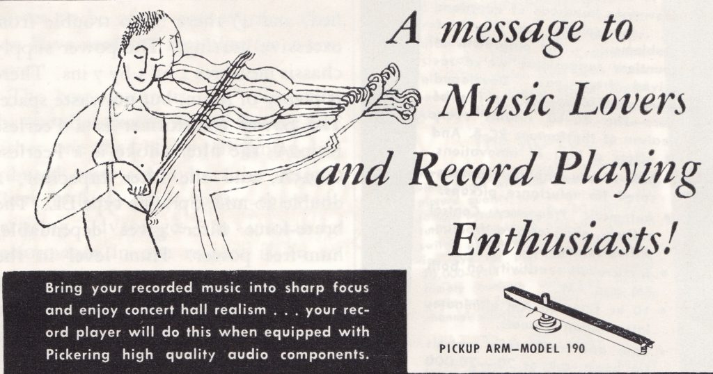 Um dem Tonarm auch auf dem Amateurmarkt verkaufen zu können, überarbeitet Pickering 1954 sein Modell. Die 190 D genannte Ausführung baut kürzer und endet bei meinem Exemplar in einem fächerförmigen Gegengewicht. Auch keine Ausgeburt an Eleganz, doch immerhin lässt sich der Arm dadurch auch in einem knappen Schrankabteil installieren, in dem Plattenlaufwerke in den 1950er Jahren oft eingebaut waren. Pickering betont, dass der 190 D für das Abtasten von Vinyl- und Schellackplatten gleichermaßen geeignet ist. Und dass der Arm mit einem gegebenen Tonabnehmer angeblich 50 Prozent weniger Auflagedruck als vergleichbare Modelle anderer Hersteller benötigt.