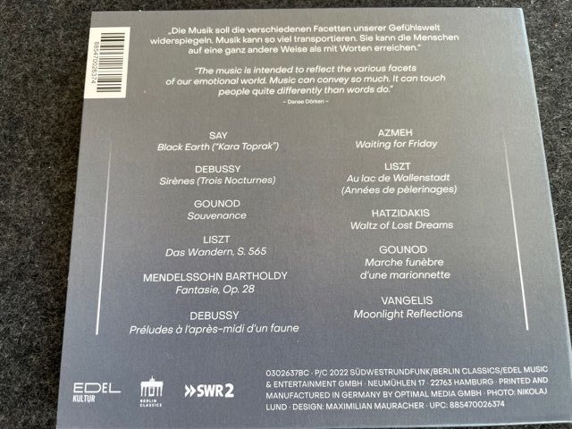 Wenn man die heutigen Aufgaben und Probleme lösen will, und das müssen wir alle um zu überleben, muss jeder für sich u n d zugleich als Teil der ganzen Menschheit handeln. Genau dies will Danae Dörken durch die Auswahl der Stücke und ihre besondere Art des Spielens deutlich machen und das gelingt ihr in einer wunderbaren Form. Unterstützt wird dies durch einen sehr klaren und warmen Klang des Steinway & Sons Flügels. Erschienen ist die Ende Juli 2021 im SWR Funkstudio in Stuttgart aufgenommen CD bei Berlin Classics.