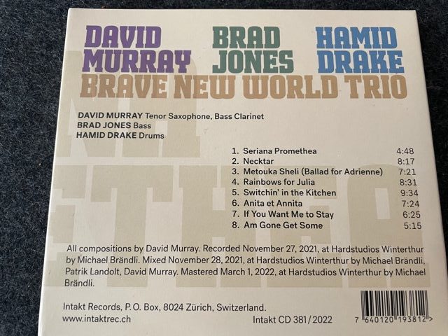 Ende November 2021 gingen die 3 Musiker in Winterthur ins Studio um diese Platte einzuspielen. Aber keine Sorge, es ist keine CD mit besinnlicher Adventsmusik. Im Gegenteil: Von der ersten Sekunde an zeigen die 3, welche Energie ein Trio entfachen kann. Alle 8 Stücke stammen von Murray, dessen Saxophon und Bass Klarinette die Melodien und die Töne in neue Sphären führt. Brad Jones am Bass und der absolut großartige Hamid Drake am Schlagzeug bilden eine Basis, wie in Stein gemeißelt und dennoch so schnell, interaktiv und impulsiv, dass einem an einige Stellen schon fast etwas schwindelig wird. Das ist Jazz dieser so herausfordernden Gegenwart, mit akustischen Ausblicken in die Zukunft. Der Titel, entliehen von Huxleys Werk Brave New World, ist Programm und diese drei Musikvisionäre verstehen sich offenbar blind und wollen alle in eine Richtung. Nach vorne. Immer!