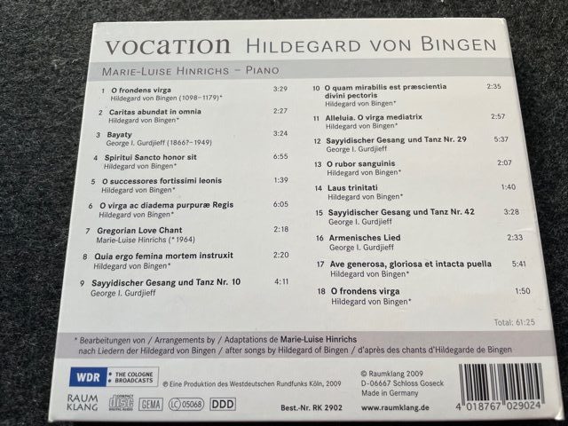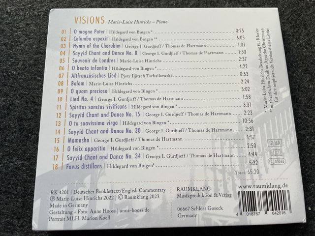 Viele Alben sind gefolgt und alle waren, wie auch ihre Einspielungen vor 2009, wirklich sehr gut. Aber ich will ehrlich sein, an meine ganz persönliche Faszination für die „Vocation“ kamen sie nicht heran, was aber bitte ausdrücklich nicht als Kritik an den anderen Alben zu verstehen ist. Und nun erhielt ich ihre neue CD: „Visons“. Die Freude war groß, denn nun hat wieder Werke von Hildegard von Bingen und Georg I. Gurdjieff bearbeitet und wieder hat sie sie auf dem großen Steinway D eingespielt und wieder war es das Raumklang Label, dass sie aufzeichnete. Hans Giese stimmte wieder den Flügel genau auf den Punkt, Sebastian Pank (hier der Tonmeister) war wieder mit dabei und sogar das Grafik Design wurde von der selben Person geschaffen, der großartigen Anne Hoos. Also alles so wie vor 14 Jahren, bei der Einspielung von „Vocation“? Ja!