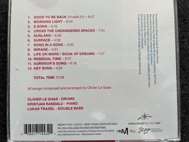 Die 12 Songs hat Olivier le Goas speziell für dieses Album geschrieben und wurden von ihm bewusst in verschiedenen Kompositionsformen erschaffen, die er im ausführlichen Booklet erläutert. Die Stücke spiegeln verschiedenste Spielarten des Genres Jazz-Trio wider. In einzelnen Parts wird man an große andere Trios erinnerst, was aber nicht als Anlehnung an diese zu werten, sondern als Zeichen für die enorme kompositorische Kompetenz und die Fähigkeiten der drei Musiker zu verstehen ist, mit allem bestehenden und vielleicht schon bekannten zu arbeiten und dabei dann etwas ganz eigens zu kreieren. Trickreiche Rhythmen, spielerische Melodien und harmonischen Linien und feinste dynamische Abstufungen bei den „Gesprächen“ der drei in den Songs. Aufgenommen übrigens im bekannten Bauer Studio und Ludwigsburg, überzeugt die CD auch klanglich in jeder Hinsicht.