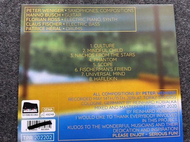 Der Saxophonist Peter Weniger stellt hier 8 eigene Kompositionen vor, die er mit großartigen Musikern eingespielt hat: Hanno Busch (Gitarre), Florian Ross (E-Piano), Claus Fischer (Bass) und Patrice Héral (Drums). (Videos unten)