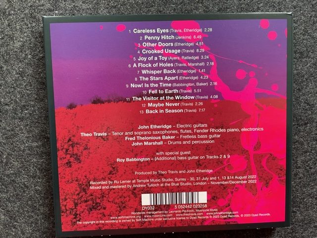 Die Band wird seit den 70er Jahren von John Etheridge geleitet, der die Band mit vielen immer neuen Mitgliedern durch die Jahrzehnte geführt hat. Und auch das neue Album, aufgenommen bereits im letzten Jahr, ist wieder eine echte Soft Maschine Produktion: Jazz mit atmosphärischen Improvisationen, vermischt mit Elementen aus dem Genre des psychedelischen Jazz-Rock und zum Teil experimenteller elektronischer Musik. Erstmals mit anbei ist der Bassist Fred T. Baker und unterstützt wird die Band auf 2 Titeln von dem Bassisten Roy Babbington. Letztmalig mit dabei ist übrigens die Schlagzeigerlegende John Marshall.