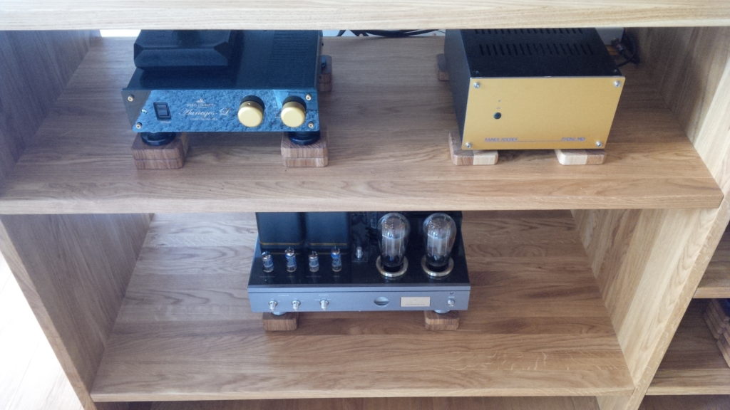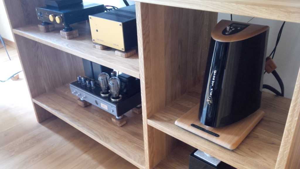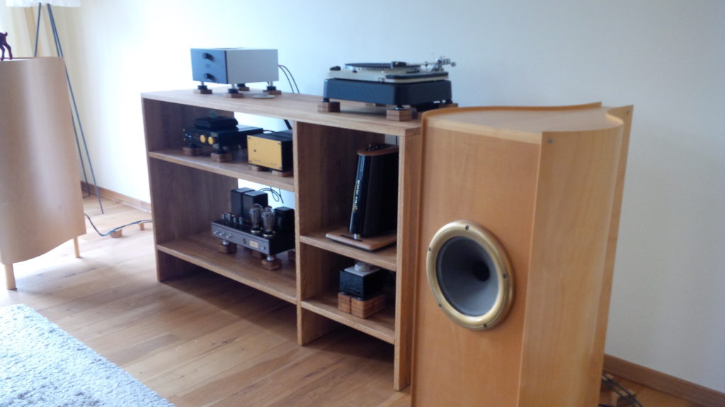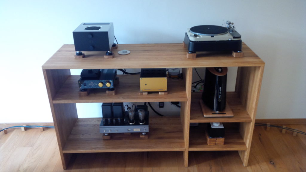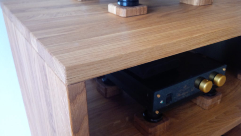 Als Werkstoff hat sich für mich nach einigen Experimenten allein Holz als das beste herausgestellt. Besonders europäische Eiche, immer nur ökologisch geölt. Ja, Holz hat durch seine Resonanzeigenschaften unmittelbar positive Auswirkungen auf die darauf stehenden Geräte oder Lautsprecher, aber die sind meiner Meinung nach nicht das Wichtigste.