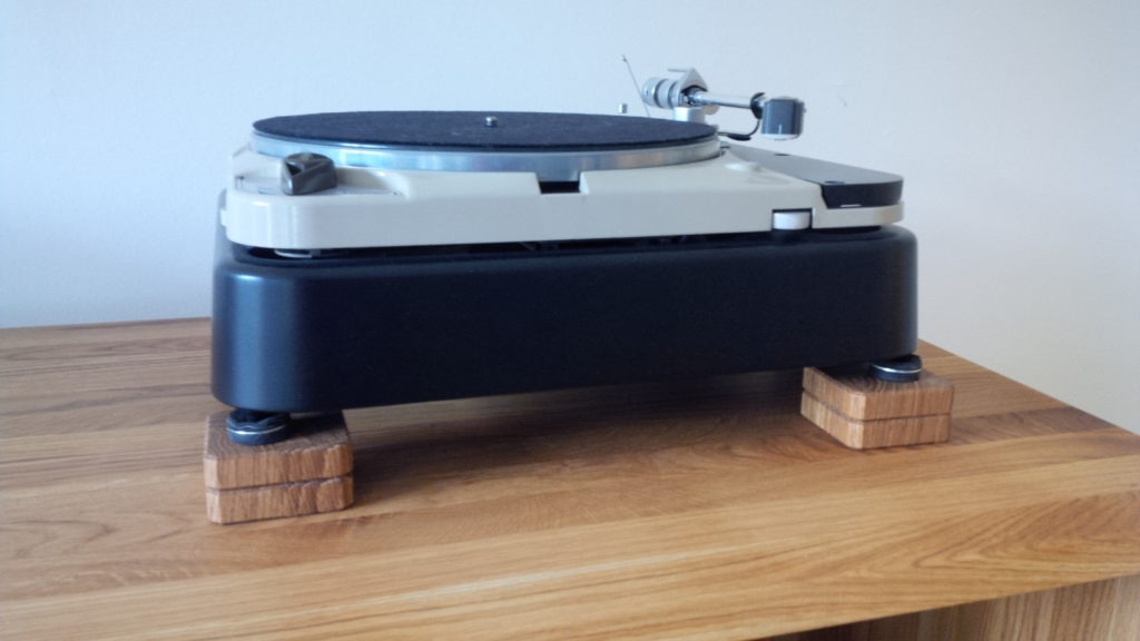 Bei meinen Geräten nutze ich Unterstellhölzer unterschiedlicher Höhe. Nicht nur, um die Geräte ruhiger zu stellen (Glas oder Stein fiel bei meinen Tests als Unterlage immer durch) sondern um den Kamineffekt und damit die Kühlung der Geräte zu fördern. Insbesondere Röhrengeräte haben im Boden Lüftungsschlitze. Stehen diese also höher, können sie mehr frische und kühlere Luft anziehen und das ist immer ein großer Vorteil. Auch bei vielen Transistorgeräten funktioniert das sehr gut, da diese nicht selten warme Böden haben, die dann, Wärme steigt ja nach oben, diese im Gerät belassen. Je nach Höhe der Temperaturen sind es daher unterschiedliche Bauhöhen, die ich einsetze. Aber alle sind gleich aufgebaut, so dass diese auch optisch zueinander passen.