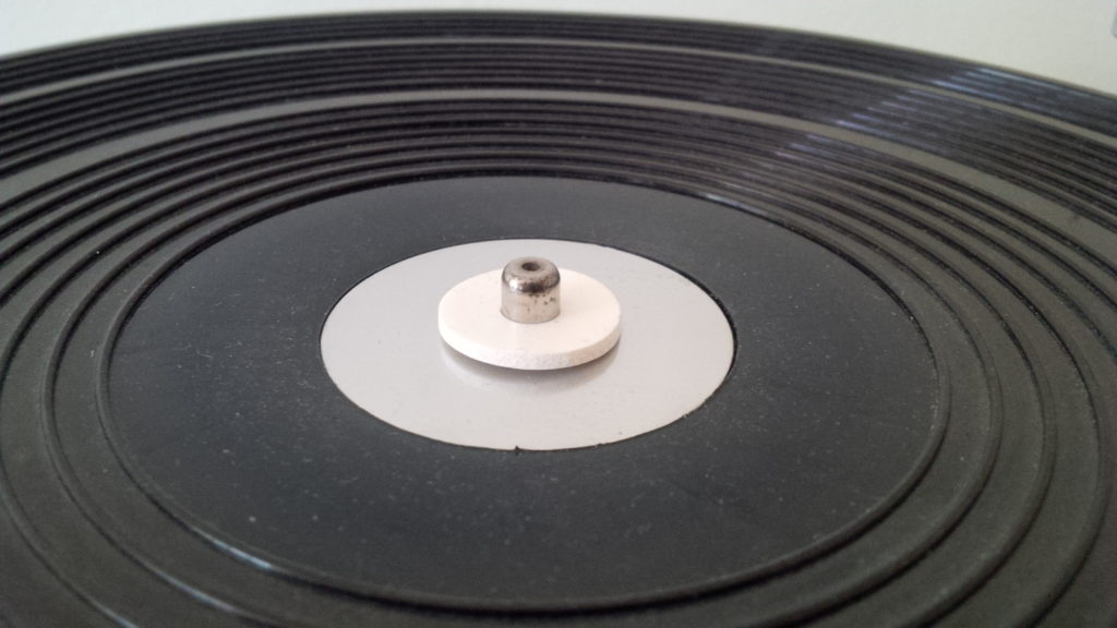 Die beiden weißen kleineren „Unterlegscheiben“ sind jedoch unverzichtbar. Eine der beiden wird über die Mittelachse des Laufwerks gesteckt und bleibt dort dann, wenn Sie die DÄD!CLÄMP einsetzten wollen. Für Teller und Matten ohne Labelvertiefungen reicht die 2mm starke aus, bei denen mit solchen Vertiefungen sollte die 3mm starke Version eingesetzt werden.