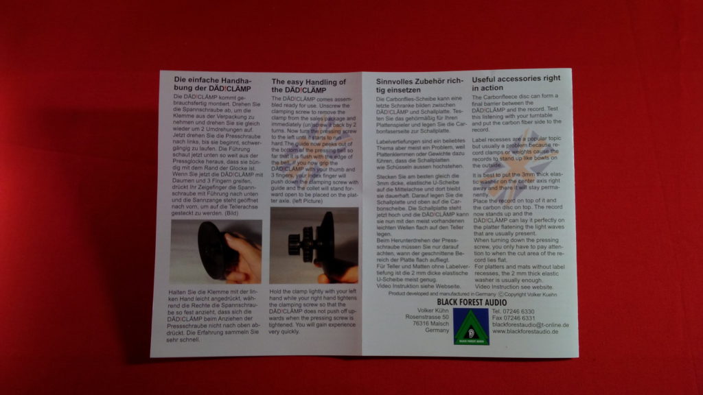 Die DÄD!CLÄMP kam, wie alles aus dem Hause von Volker Kühn, dem Mann hinter Black Forest Audio, perfekt verpackt und mit einer vorbildlichen Bedienungsanleitung. Ich muss das erwähnen, denn es ist selbst heute noch keine Selbstverständlichkeit. In dem Paket befanden sich neben der Klemme und der BA zwei Tütchen mit jeweils 2 dünnen schwarzen Scheiben und zwei wesentlich kleineren, weißen weichen Unterlegscheiben (2mm und 3mm dick).