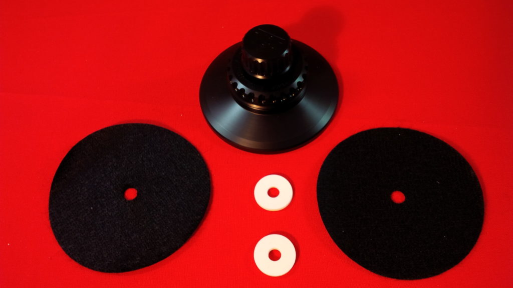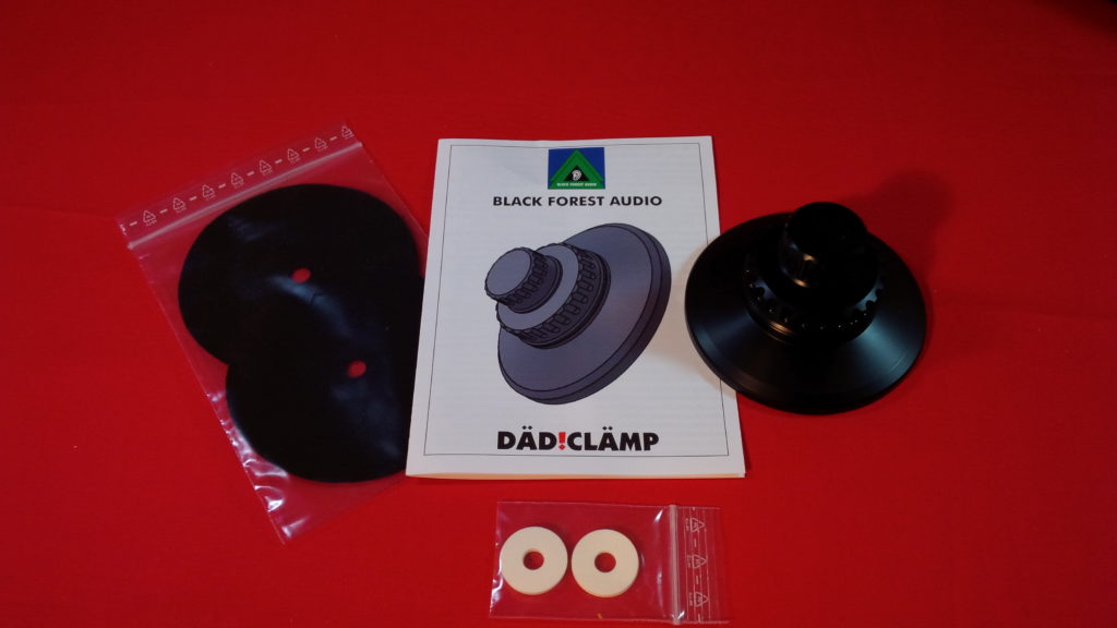 Bei den schwarzen dünnen handelt es sich um Carbonflies-Dämpfungsscheiben, die man auf die Platte legen kann, bevor man die DÄD!CLÄMP einsetzt, wobei die Carbonfaserseite zur Schallplatte zeigen sollte. Dies ist für die Funktion der Klemme selbst nicht zwingend erforderlich, kann aber, je nach Laufwerk, das letzte Hindernis für Störungen zwischen Platte und Klemme bilden. Hier kann man ganz einfach gehörmäßig vorgehen. Ich habe bei den Tests darauf verzichtet, denn es war auf meinen Test-Laufwerken kein Unterschied hörbar.