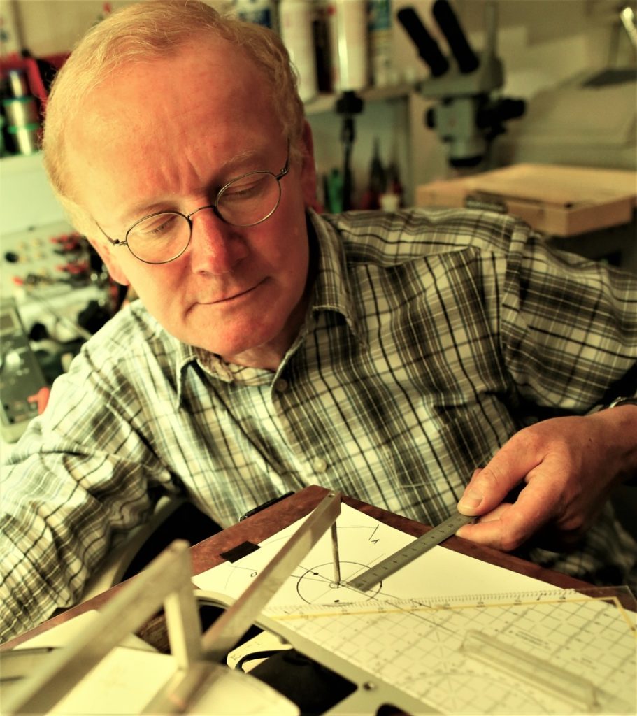 Peter Feldmann bei der geometrischen Bestimmung der Tonarmposition auf einem TD-124-Armbrett